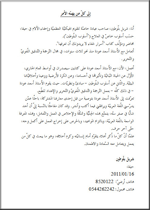 قالوا عنّا توصية الأستاذ فتحي فوراني توصية الأستاذ علاء حليحل توصية الأستاذ أنطوان شلحت توصية الأستاذ شربل بلّوطين توصية الأستاذ شربل عبّود توصية الدّكتور شادي جهشان توصية الأستاذ هاني طاهر شهادة رابطة المترجمين (ITA)